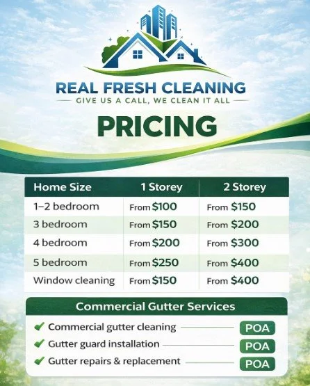 Every job at Real Fresh Cleaning covers the full scope — gutters cleared, downpipes checked, and all debris removed from your property. We use industrial gutter vacuuming equipment, not just a garden hose, which means a proper clean rather than just pushing debris along.